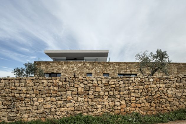 The material palette comprises sandstone cladding for the site boundary and u-shaped wall, white concrete for the roof and structure, and low energy glazing for the inner facades. The southern orientation of the house and its massing allows for natural lighting, cross ventilation and passive cooling for all spaces; canceling the need for air-conditioning during the long Mediterranean summer, while benefiting from the optimum sun exposure during winter.