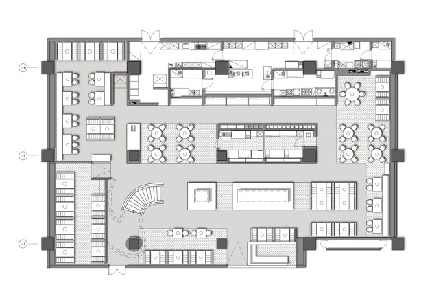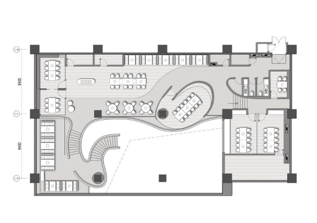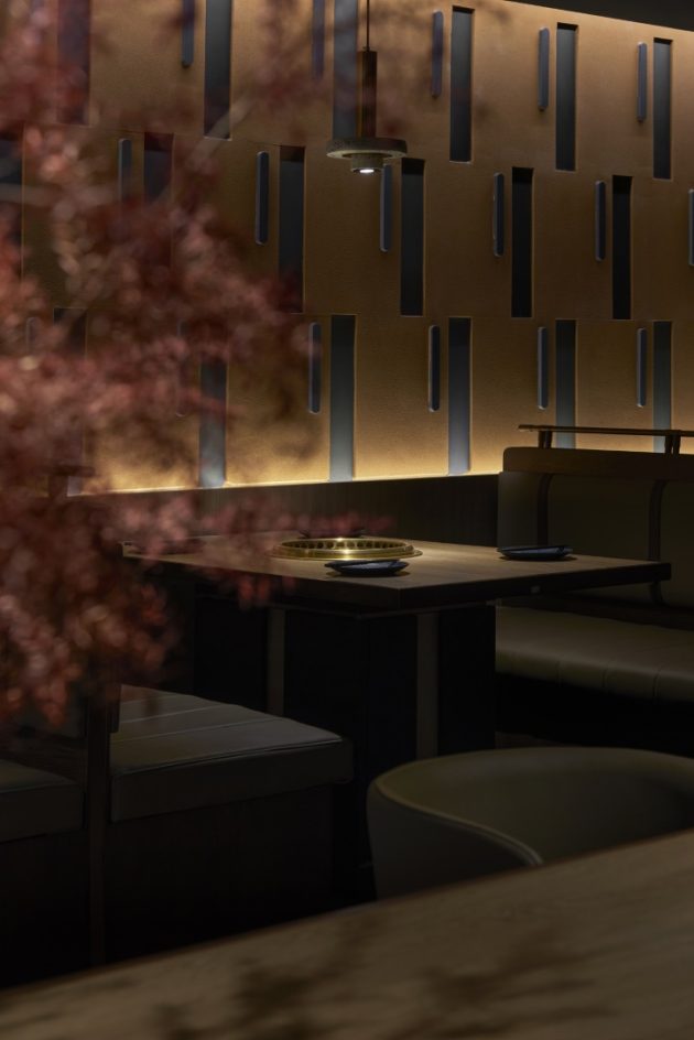 Dining tables on the first floor are positioned in staggered patterns to create dynamic plays of light and shadow, producing different atmospheres within one expansive space. The design carefully balances rigidity and softness, square and fluid lines, light and dark—a rhythm that enlivens the restaurant while preserving intimacy.