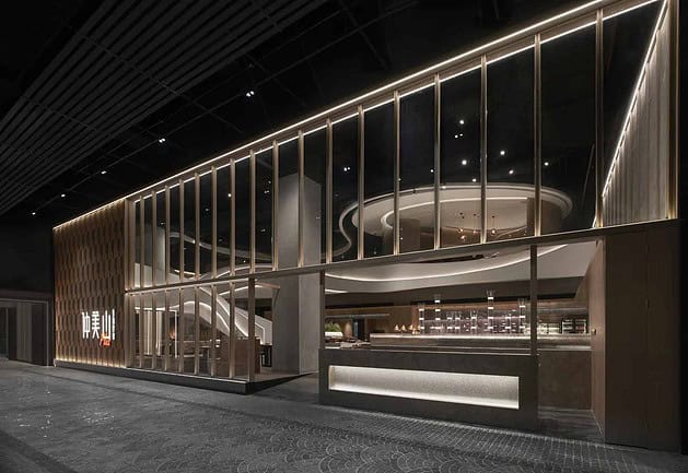 Zhongmeishan, a popular dining brand originating in Wudaokou, opened its first upgraded flagship store in Olympic North, one of Beijing’s most prestigious residential areas. To capture the attention of a high-end clientele, the brand collaborated with FUNUN LAB, known for innovative restaurant design across Beijing.