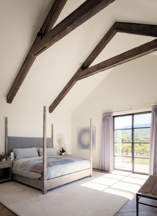 An exciting intersection between modernism and vernacular design emerges from Field’s continual re-engagement with the spatial repercussions of the vernacular. Field framed the steeply sloped ceiling differently in each room of the house — from the skylight that disappears into the gable’s peak and floods the hearth with light, to the dramatic slice the ceiling takes through the hallway, where the roof reaches its resolution at exterior walls made of glass and steel. Light spills into the house from every side through the windows, which open the interior up to the courtyard and extend the home’s visual boundary out into the vineyard beyond.