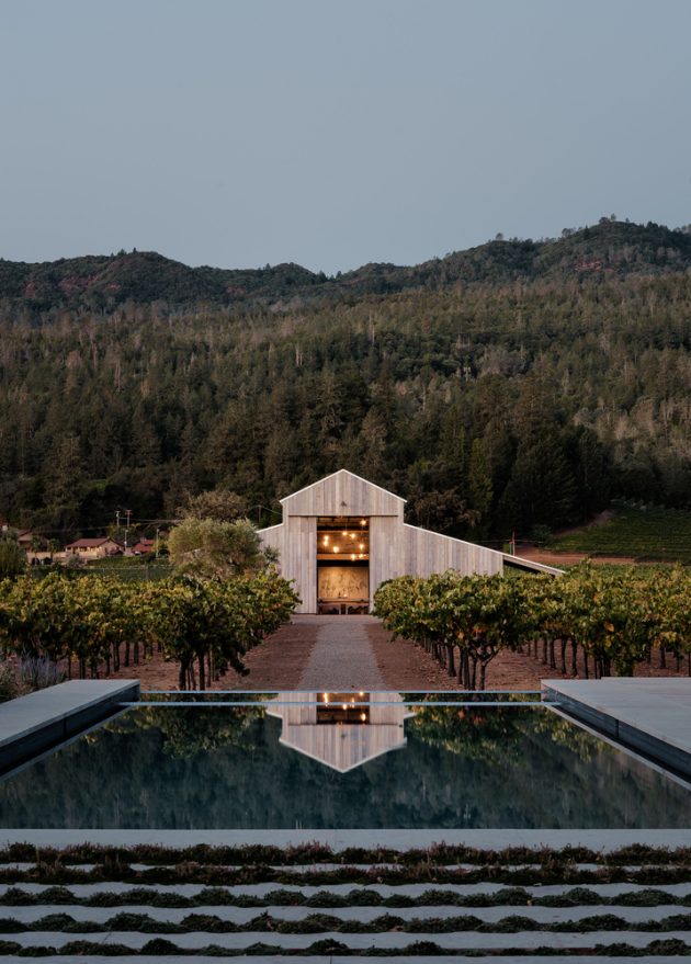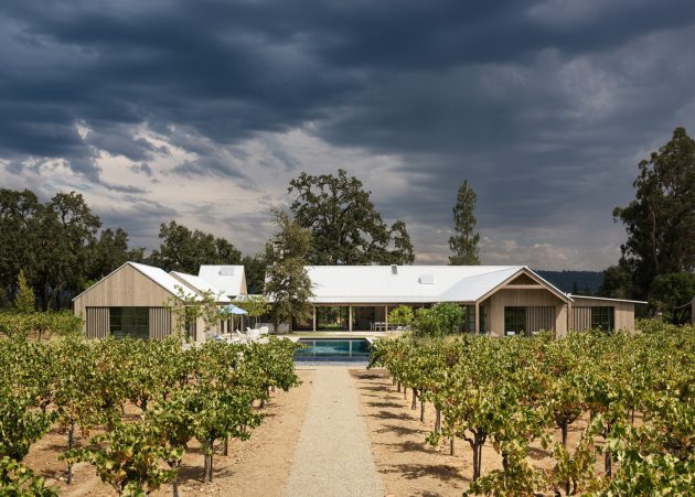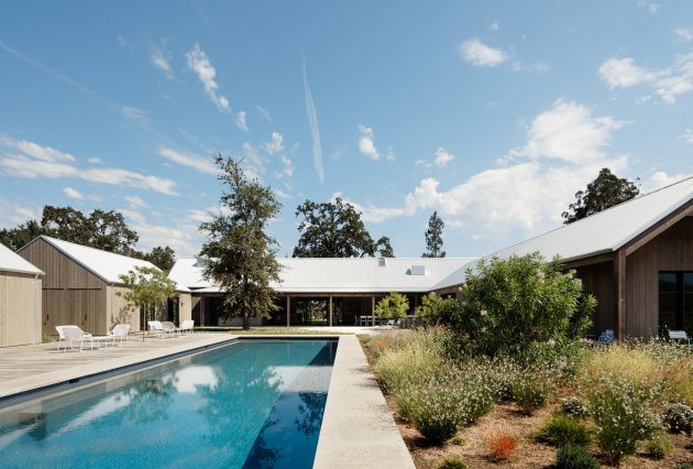 When a young couple with a growing family wanted to take a step back from the city, they found an old vineyard parcel in Napa Valley that looks out towards the Mayacamas. On that site, Field Architecture designed a house that makes room for both small and large gatherings where the family can spend time connecting with the land and with one another. The property sits on the valley floor, the only vertical moment a line of tall trees in the northeast corner. Field nestled the home — designed as a family of structures — between the trees, leaving a courtyard space in the center and filling it with a luxuriously modern pool. A grand valley oak marks the central axis threading through the building.