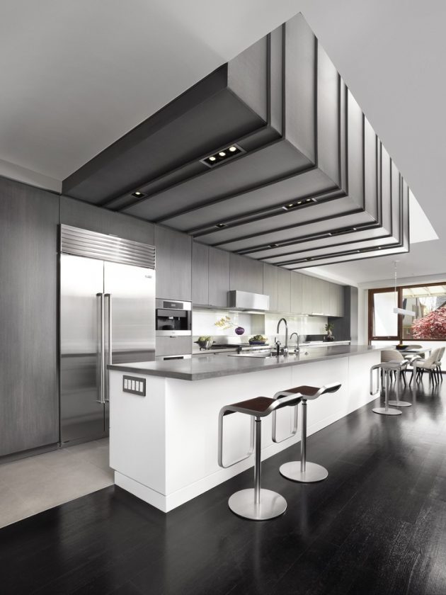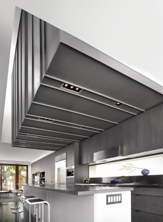 Grey and black zinc used throughout both the exterior and interior of the home is a material that blends traditional aspects with the new contemporary scheme. Inside, a vertical shaft brings light from large skylights down 3 floors illuminating the ground floor while animating a zinc wall and ceiling above the kitchen.